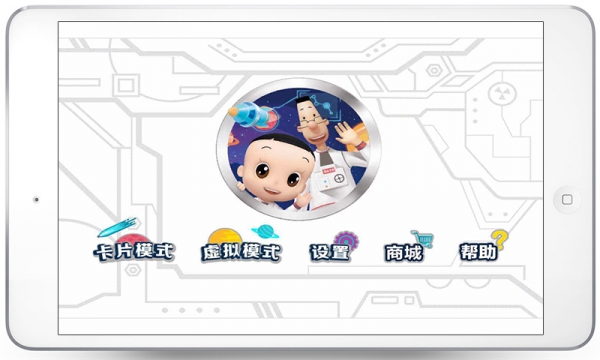 点击主菜单上的卡片模式,进入后,通过摄像头识别相应的实体卡片,在设备屏幕上会出现相应的3D大头儿子,动物,数字,英文站立或悬浮在卡片上,随后可以操纵屏幕与它们进行360°旋转、放大缩小、拖拽移动它们的位置等互动。并且可以和3D大头儿子拍照,合影,以及拍摄小视频。用户可以上传自己拍摄的视频作品到云端保存,在视频中心可以查看自己的小视频和其他用户的小视频。